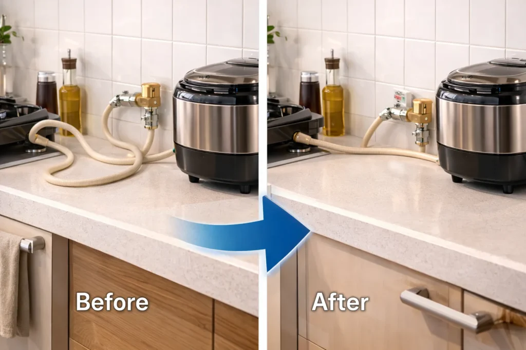 「ガス栓があるから大丈夫」と思っても、ホースが無理なく届くか、動線の邪魔にならないかは別です。